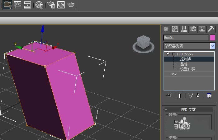 5、在【FFD】命令面板上,修改控制點2乘2參數,用鼠標將其向右拖動,此時可看到長方體發生改變,如下圖所示。