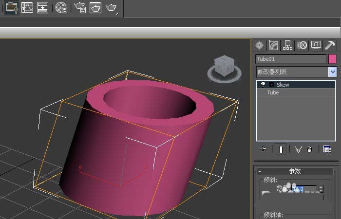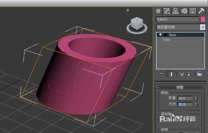 5、在【傾斜】命令面板上,修改傾斜方向參數,將0修改為20,此時可看到管狀體發生傾斜方向上的改變,如下圖所示。