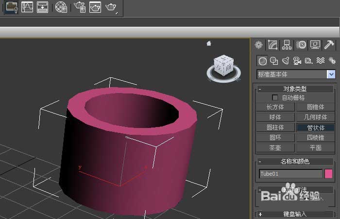 1、打開3d max軟件(這里用的3d max2010版的軟件)。可看到四個視圖窗口,在窗口的右邊,鼠標左鍵單擊面板的【幾何體】按鈕,選擇【標準基本體】,在透視圖上,拖動繪制管狀體出來,如下圖所示。