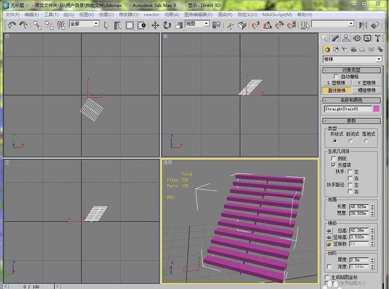 1、在3dmax里其實有好幾種內置的樓梯模型,L型、U型、直線型、螺旋型,再用的時候直接拖出來就行,只不過會有很多面數。比如這一個樓梯就有228個面。
