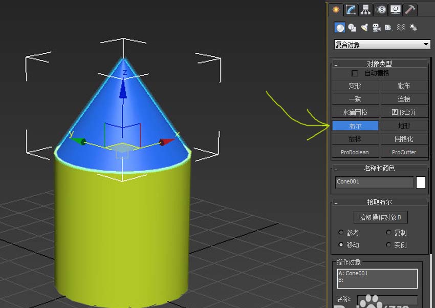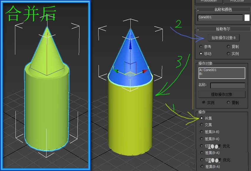 4、在“布爾”的“操作”欄內點選“并集”后,再點中最上面的“拾取操作對象B”按鈕,然后再選中另外一個物體即可。該方法可以將兩個模型完整的合并為一個物體。