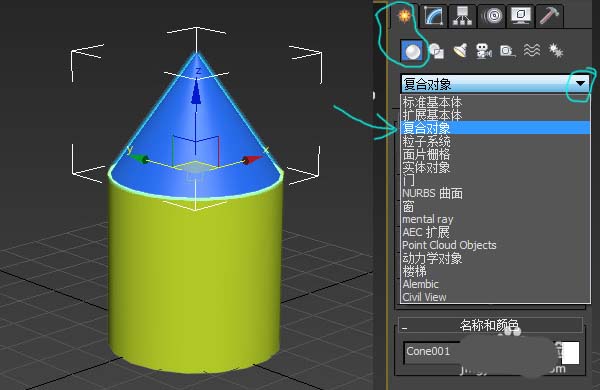 2、選中其中一個物體,在創建欄里選擇“復合對象”。