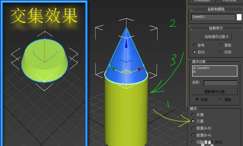 5、事實上,“布爾”合并物體的功能是比較完善的,在“操作”欄內的其它選項則可以實現其它合并功能。“交集”可以實現只合并兩個模型相交融的部分。