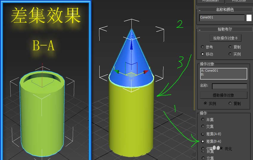 6、”差集“則是常用的去掉兩個物體的接觸部分,并將其中的一個物體去除,而去除哪一個物體則取決于是選擇了”A-B還是”B-A“。