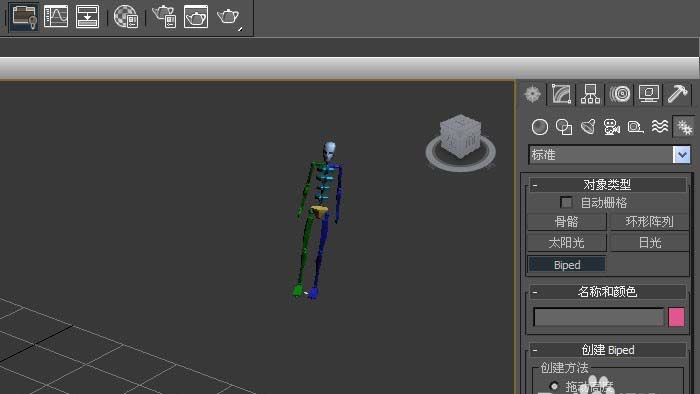 6、在【標(biāo)準(zhǔn)】的面板上,鼠標(biāo)左鍵單擊【Biped】,接著在透視圖中,拖動(dòng)繪制Biped對(duì)象出來,如下圖所示。