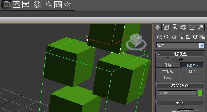 3、在【標(biāo)準(zhǔn)】的面板上,鼠標(biāo)左鍵單擊【環(huán)形陣列】,接著在透視圖中,拖動(dòng)繪制環(huán)形陣列對(duì)象出來,如下圖所示。