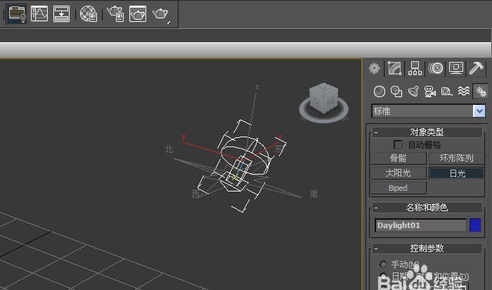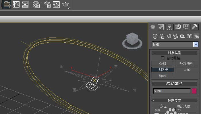 4、在【標(biāo)準(zhǔn)】的面板上,鼠標(biāo)左鍵單擊【太陽光】,接著在透視圖中,拖動(dòng)繪制太陽光對(duì)象出來,如下圖所示。