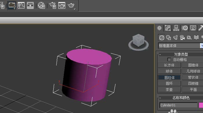 5、在【標準基本體】的面板上,鼠標左鍵單擊(圓柱體),接著在透視圖中,拖動繪制一個圓柱體出來,如下圖所示。