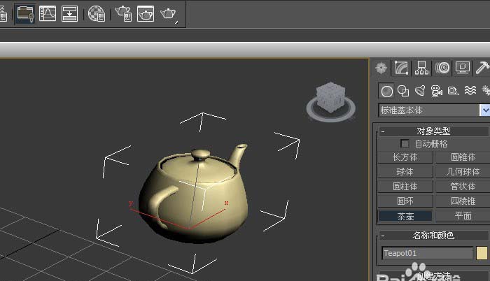 6、在【標準基本體】的面板上,鼠標左鍵單擊(茶壺),接著在透視圖中,拖動繪制一個茶壺出來,如下圖所示。通過以上的操作,可熟悉3dmax軟件的基本操作過程,就是鼠標選取對象模型,然后在視圖中,拖動使其出現,完成最簡單的3d模型的基本體。