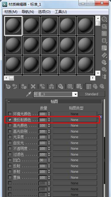 3、如圖,使用快捷鍵“M”,打開“材質編輯器”,選中第一顆材質球