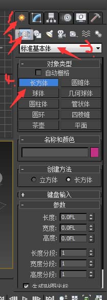 2、接著在“命令面板”中單擊“創建”按鈕,進入“創建”面板,然后單擊“幾何體”按鈕,再設置“幾何體”類型為“標準幾何體”,最后單擊“長方體”按鈕。