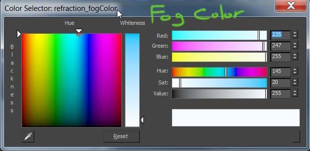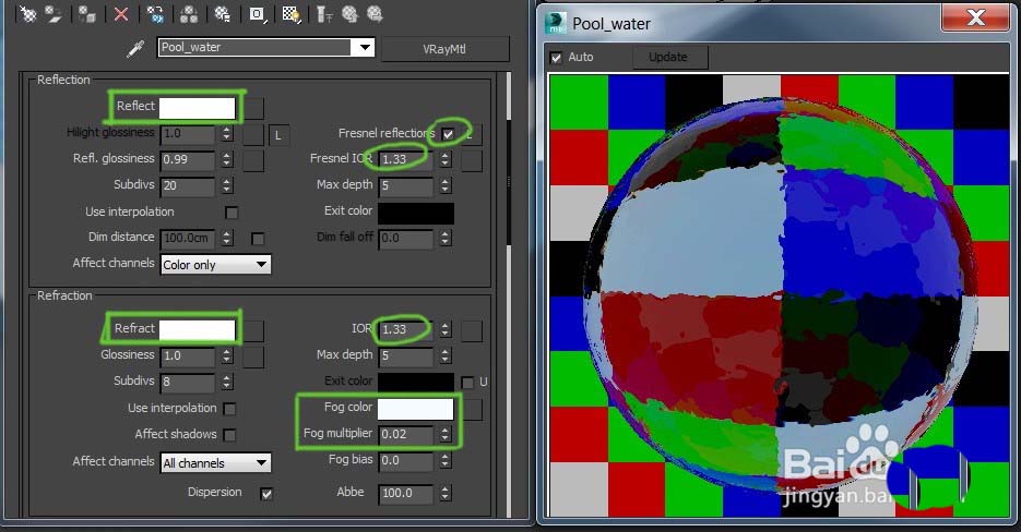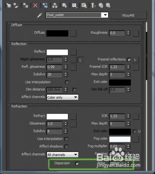 清水池很容易創建,將反射和折射顏色設置為純白色,啟用Fesnel反射,并為反射和折射設置1.33(IOR值的水)的IOR。在Fog color中設置非常淺的藍色,并將其乘數減小到約0.02,這將提高水顏色。如果水變暗,只需設置較淺的顏色或減少乘數。