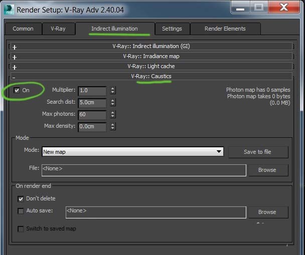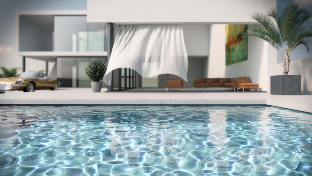 要為游泳池水創建焦散,只需在渲染設置中,Indirect illumination選項卡下打開caustics。