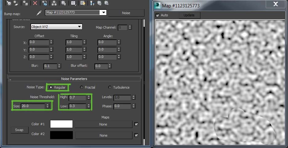 這里用了尺寸為20的regular,還通過改變噪點閾值(Noise threshold)來增加貼圖的對比度,如下圖所示。最后,bump amount設置為4.0以獲得風平浪靜的效果。