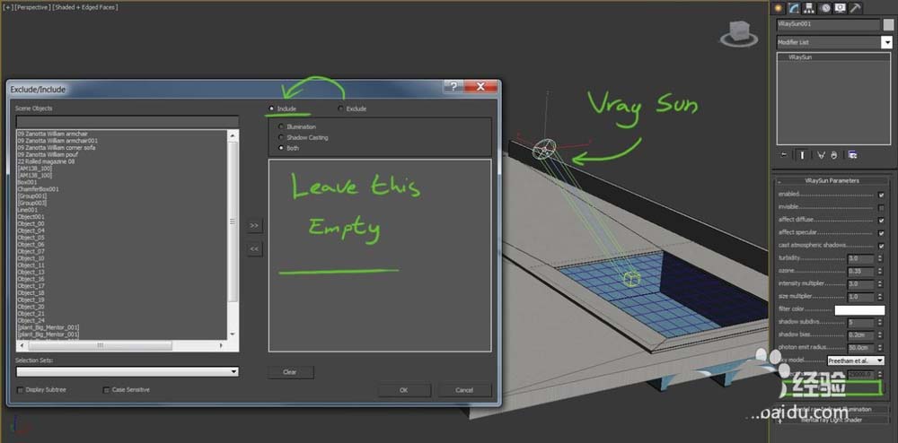 這個效果可能需要很長時間來渲染,內嵌3ds max 插件,不需要經過客戶端分析場景,直接上傳渲染。由于焦散需要直射光來創建一個光子圖,而不是使用場景中的所有光,我將創建一個單獨的直接光(在這種情況下為Vray太陽),并從中排除所有對象。這樣,只會計算焦散,而不會增加額外的照明。選擇Vray sun,然后單擊modify面板下的exclude。在彈出的窗口中,從排除到包含并將列表留空。