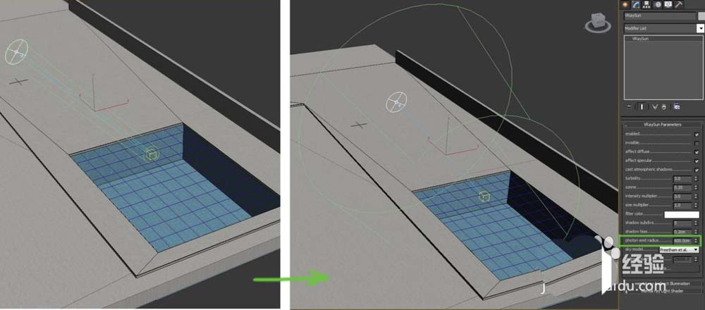 可以將太陽挪到水池中心,在修改面板中,增加photon emit radius(光子發射半徑),直到它覆蓋池。