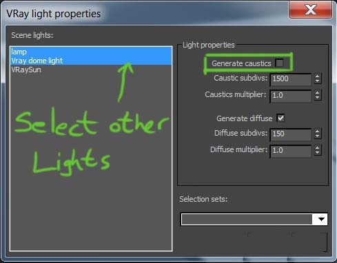 還需要選擇所有其他燈,并禁用Generate caustics選項(選擇lights - >右鍵 - > Vray屬性 - >disable caustics)。