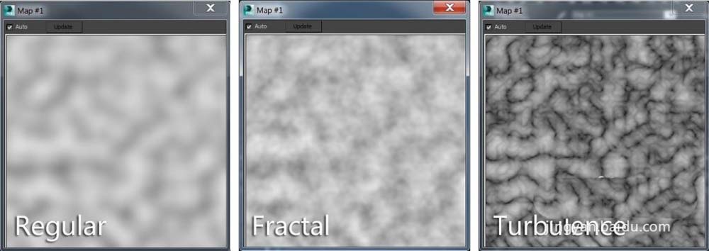 點擊bump并添加一個Noise貼圖,這個貼圖非常有用,可以通過黑色與白色來調整噪波,使平面凹凸不平。這個貼圖有3種類型的噪波:Regular、Fractal 、Turbulence。創建新材質時,可以嘗試使用這些類型,直到找到合適的狀態。