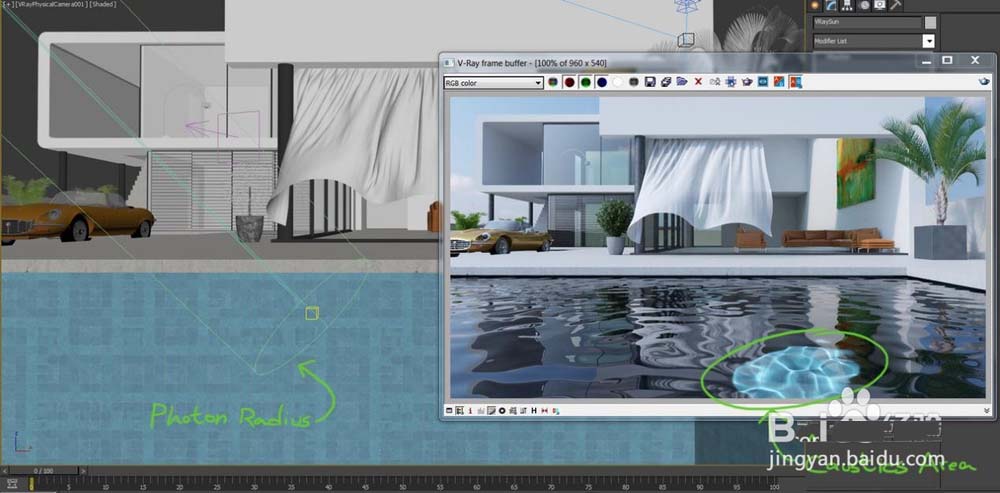 現在做一個測試渲染,去哪測試不用再說了吧,在上文中找吧~你可能這時候沒有發現水中的焦散,或者只看到了一個小圈圈,這是因為焦散區域受到太陽光子半徑的控制。看下圖我給你指出小圈圈:右下jue那個綠色的圈圈~