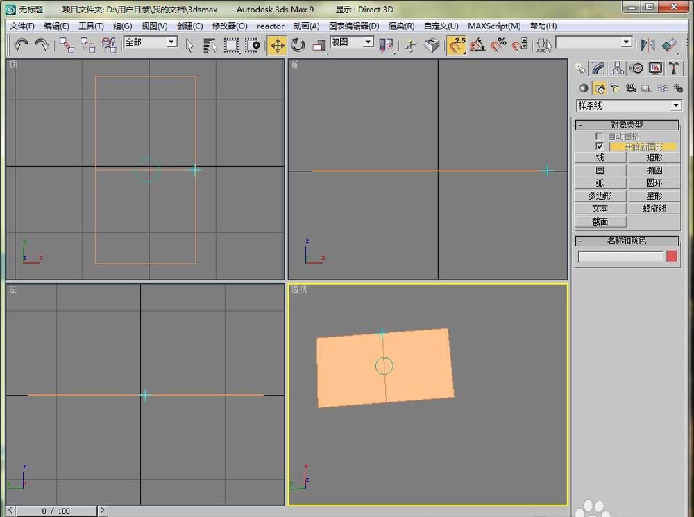 4、在創(chuàng)建面板下選擇樣條線,然后開捕捉在中點位置畫一個圓。
