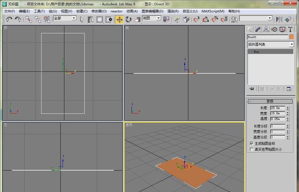 2、然后用長發(fā)體畫場地,我這里設置大小為28*15m,高度用很小的高度0.05m