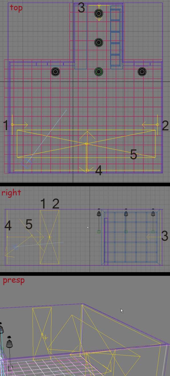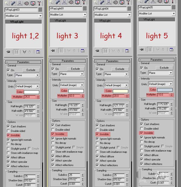 8、現在放置Vray燈光。燈光1-4直接影響場景,而燈5已經向下放置,并以間接(以反彈的形式)影響場景。