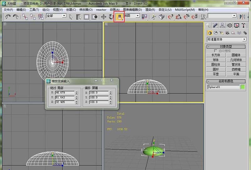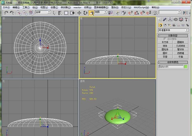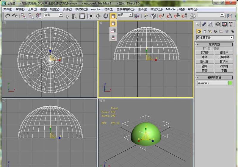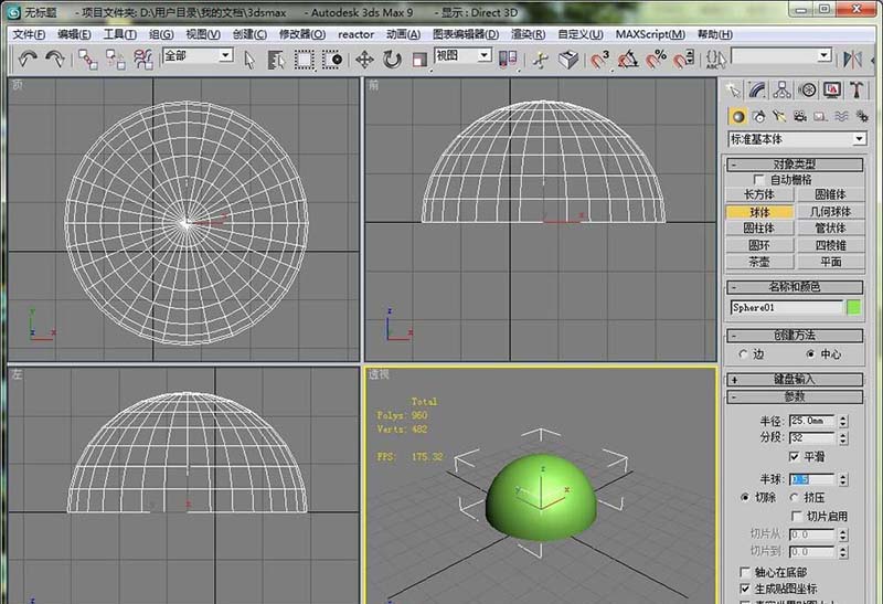 2、然后在視口區(qū)里畫一個球體。在右方的半球參數(shù)里填0.5,這樣就成了半球。