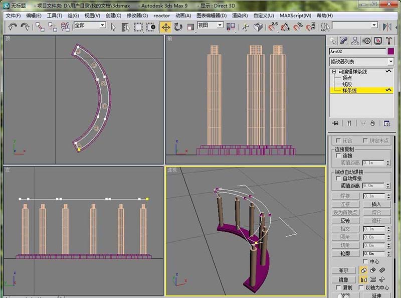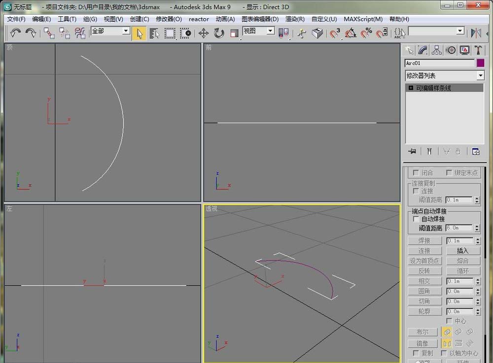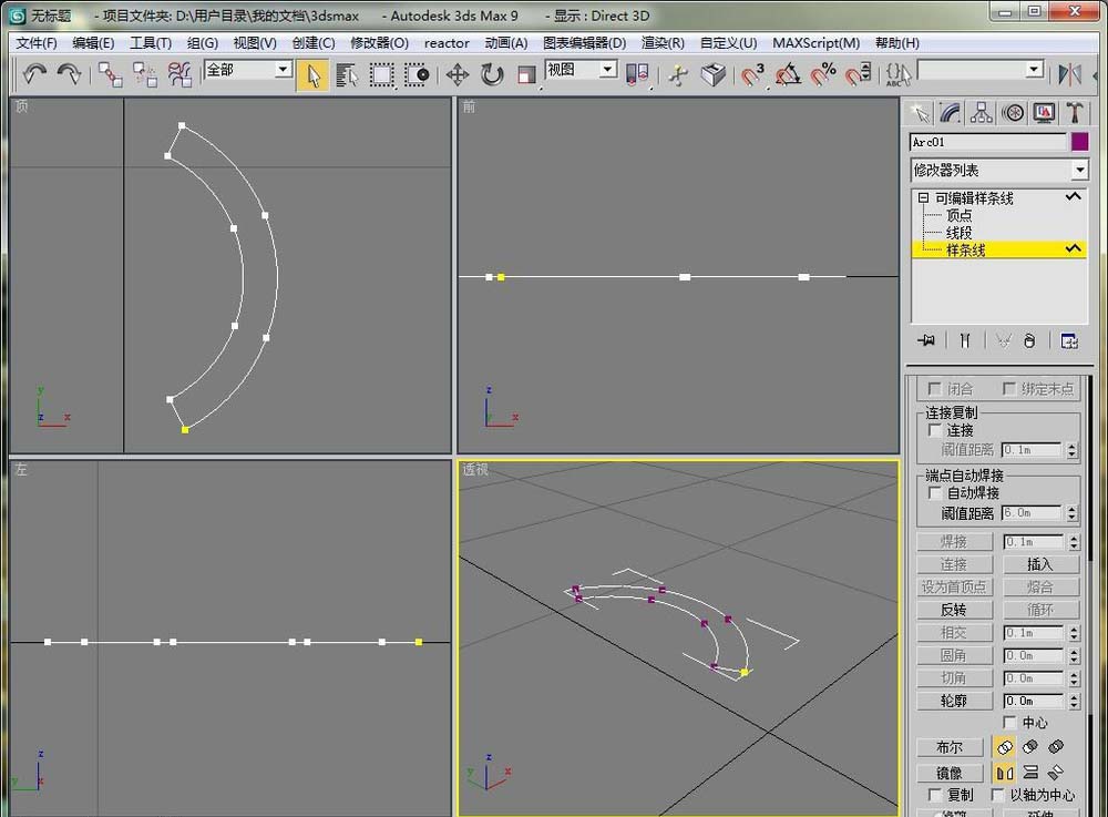1、首先在創建面板下選擇樣條線,然后選擇弧線。在頂視圖中畫一個弧段