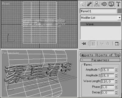 3. 進入到"Modify"面板,對其設置參數,展開"Parameters"(參數)卷展欄,將"Wave"的兩個"Amplitude"(振幅)選項都設置為15,將"Wave Length"(波長)設置為110(如圖3)。從界面中我們看到波浪運行的方向與文字對象的方向相互垂直,單擊主工具欄中的"Select and Rotate"(選擇并旋轉)按鈕,在"Front"視圖中將波浪空間扭曲物體旋轉,使之與文字對象同一個方向(如圖4)。