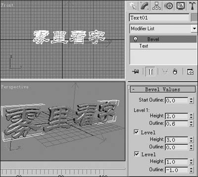 1. 打開3DS MAX 5,點擊"Front"(前)視圖,選擇命令面板中的"Create→Shapes→Text"文本對象,在前視圖中輸入文字"霧里看字",進入"Modify"(修改)面板調整好文字的字體和大?。ㄈ鐖D1),打開"Modifier List"下拉列表,從中選擇"Bevel"(倒角)修改器,對前視圖的文字設置倒角修改命令參數,對文字進行倒角設置會大大增加立體文字的金屬質感。打開"Bevel Values"(倒角值)卷展欄,對文字的層次進行設置,設置的參數(如圖2)。