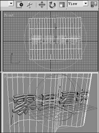 5. 單擊主工具欄中的"Bind to space Warp"(綁定到空間扭曲上)按鈕,選取文字將它牽引到波浪空間扭曲對象上,就完成了文字對象與波浪空間扭曲對象的綁定,再次單擊播放按鈕,就可以看到文字對象的動態效果了(如圖5)