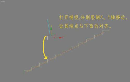 5、因為設置的是關聯復制,可以使用踏步參考圖像對樓梯踏步之間的空隙進行微調;打開捕捉按鈕,設定為以X、Y軸方向進行移動,捕捉相鄰踏步之間的端點,讓其互相對齊;