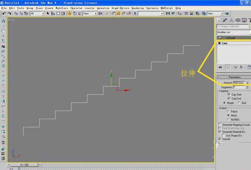 8、為踏步模型添加一個“擠出”修改器,這樣一來,二維的圖形變成了三維實體模型了;