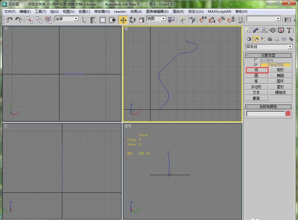 1、打開3dmax ,在創建面板下的樣條線中選擇線,然后畫一個類似于圖中的線條。