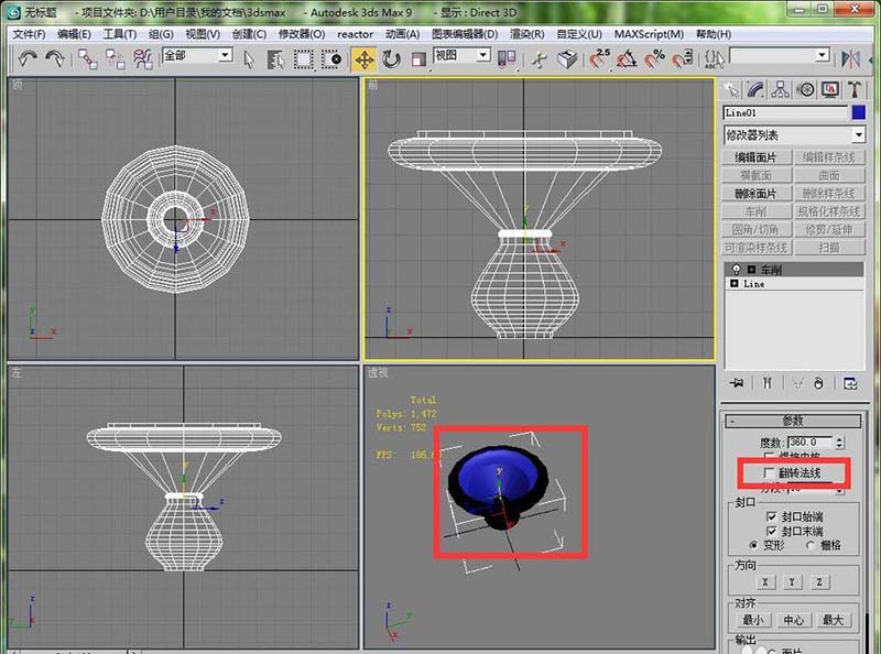 4、然后對線進行車削,如果車削之后模型的顏色在里面,而外側是黑的,只需要勾選“翻轉法線”