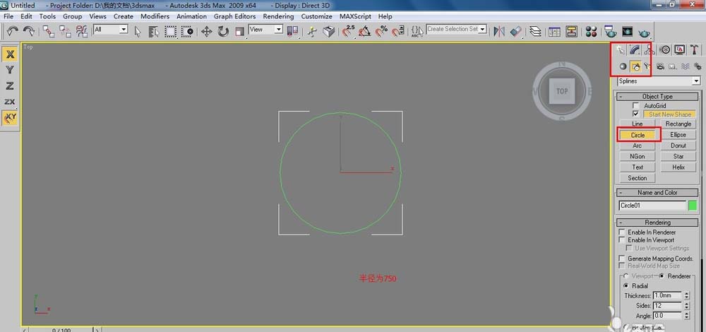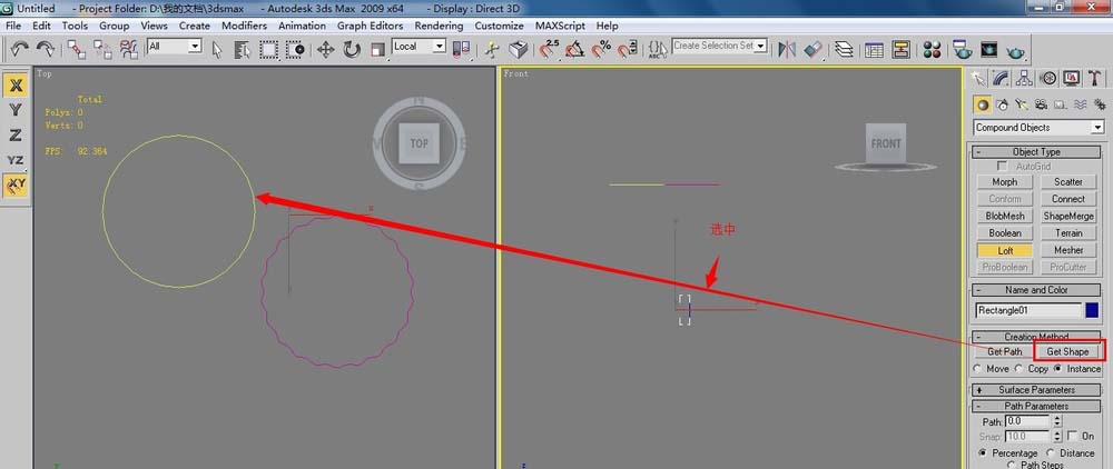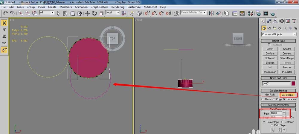 2、在前視圖中選擇直線,執(zhí)行【loft】(放樣)命令,在頂視圖中單擊圓,此時生成放樣物體。