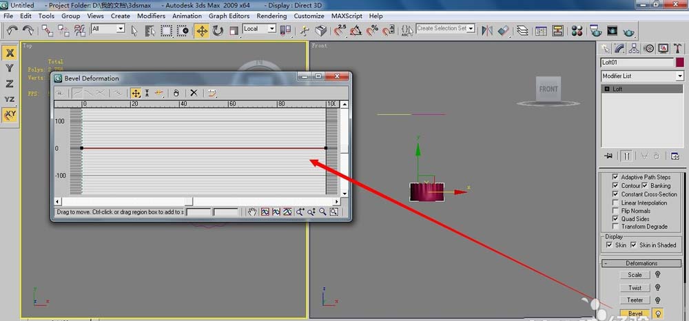4、單擊修改命令面板【-Deformations】(變形)卷展欄下的【Bevel】(倒角)按鈕,彈出【Bevel Deformation】(倒角變形)窗口。在控制線上添加一個點,調整形態(tài),如圖所示。