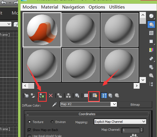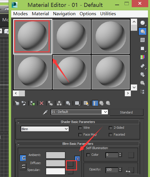 5、點(diǎn)擊material editor選項(xiàng),彈出material editor對話框,在該對話框內(nèi)選擇一個材質(zhì)球并找到diffuse選項(xiàng)后的盒子,如圖所示: