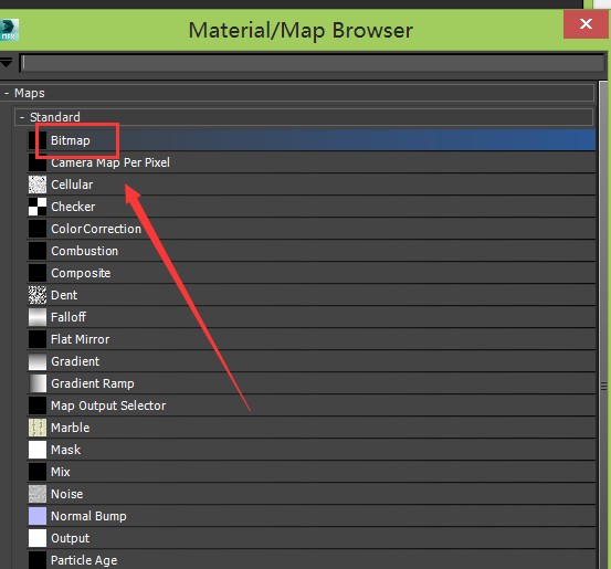 6、點(diǎn)擊這個設(shè)置盒子,彈出material/map browser對話框,在該對話框內(nèi)找到bitmap選項(xiàng),如圖所示: