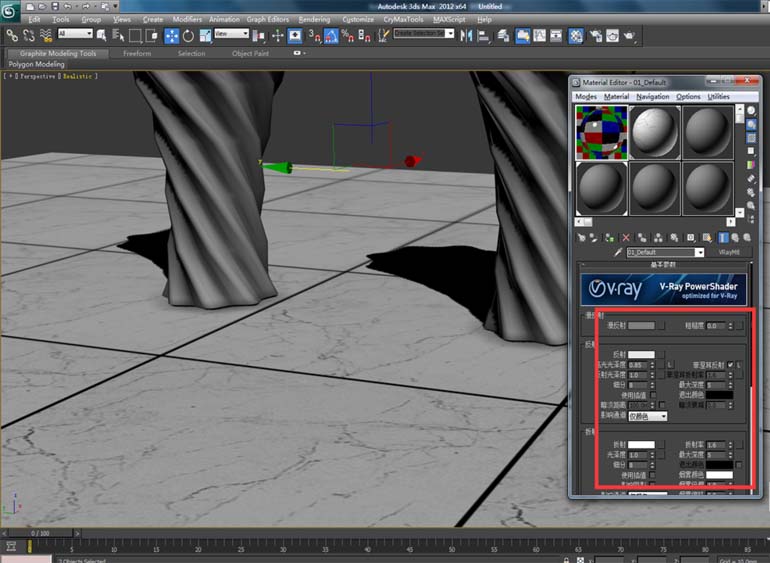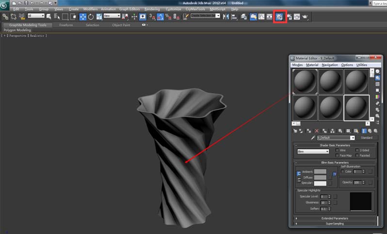 11、模型完成, 我給它添加了一個簡單的材質,打開材質編輯器,將一個材質球拖拽給物體。如圖。