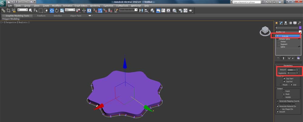 6、點選這個星形線,在右側創建命令中找到“Extrude”擠出命令,并對下面擠出命令的參數進行設置。我們可以看到一個二維圖形被我們創建成了三維立體的形狀了。如圖。