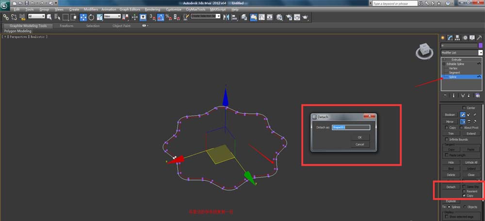 7、將“Extrude”擠出命令前的小燈泡關閉,這時我們又回到了二維圖形中,還是選擇“line”---“spline”,單擊,然后找到二維圖形中里邊的那條線,也就是圖中變紅的那條,在右側的參數中找到“Detach”分離命令,并勾上下邊的“copy”選項,單擊這時會出現一個小對話框,我們將其重命名為“line”確定,這樣既可將我們線復制并分離出來了。如圖。