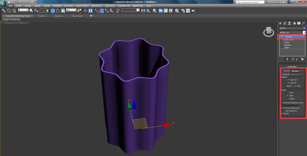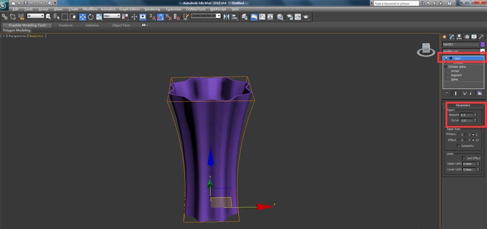 9、點擊之前的圖形,將擠出命令前的小燈泡點亮,這時我們發現花瓶完成了,但是過與簡單。在修改命令中找到“taper“錐化命令,并進行下面設置,這里可以根據你們的情況進行設置。如圖。