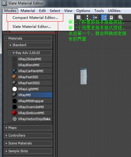 3dmax2010的材質編輯器如圖,而3dmax2012是這樣的,auto公司為了使用者在兩種不同版面的材質編輯器之間轉換,是提供了新版本轉成老版本的,如圖。。