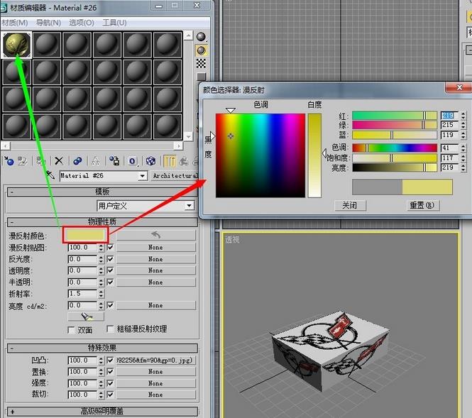 1、首先打開軟件,建立一個長方體和打開材料編輯器(M快捷鍵),并且點擊成建筑材料,得到如圖界面: