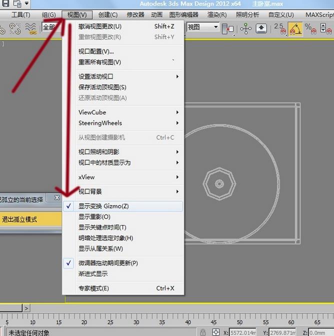 2、不小心把坐標軸給關閉了。這時只需點擊菜單欄的視圖,然后把“顯示變換Gizmo”勾選就可以了。