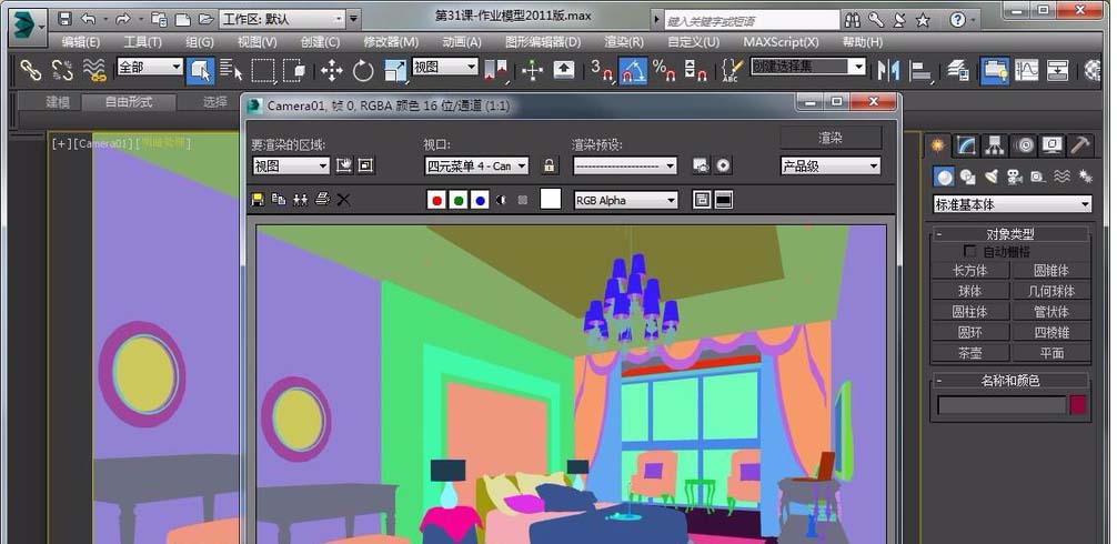 3、當前面的步驟完成后,就是渲染出色彩通道圖了。(這里小編也給大家提個醒,渲染色彩通道圖是需要把渲染器切換成默認渲染器和要把所有的燈光都刪除才可以渲染的哦)(看圖:已經(jīng)渲染出色彩通道圖了)
