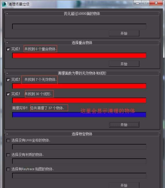 3、打勾的選項再點擊“開始”即可清理垃圾。清理完后會顯示共清理了多少物體(請看圖)清理完后可以保存文件了哦