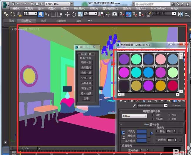 2、當我點擊“后期通道”后就會發(fā)現(xiàn)場景模型顏色和材質球顏色已經(jīng)發(fā)生了變化,這就是色彩通道圖,(就是生成一個模型單獨一個顏色)