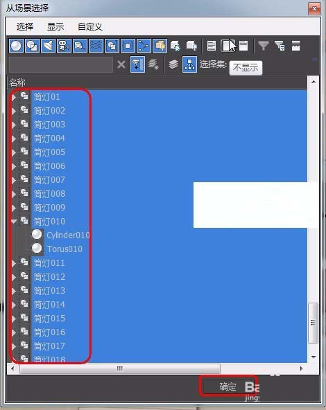1、按快捷鍵H鍵,快速打開“從場景選擇”窗口,選擇場景中所有的筒燈,3DsMax2015中文版如圖所示。